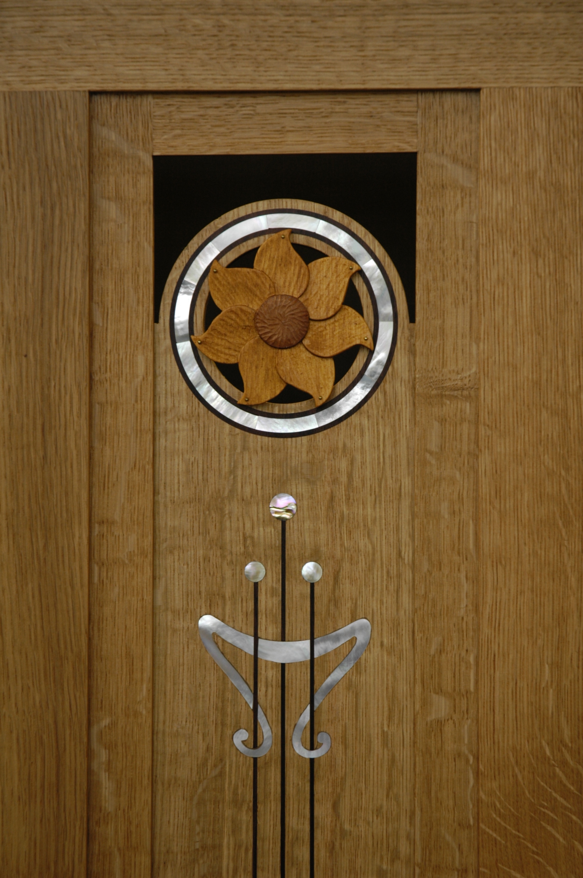 Roberta Bond’s visual design, in Arts and Crafts style, has been executed in quarter-sawn white oak, with inlays of boxwood, pear, ebony and mother-of-pearl by master woodworker John Stump. Twenty-nine pipes of the 4’ Principal, of 28% tin, make up the display. Stop knob faces and the builder’s nameplate are engraved in a typeface by Frank Lloyd Wright.