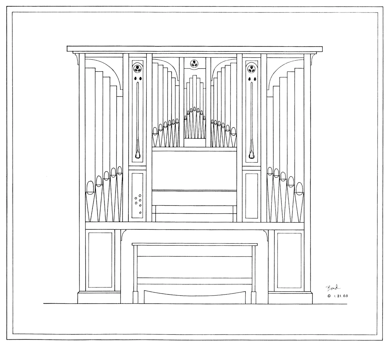 Mechanically the organ is similar to Bond’s larger two-manual instruments, employing suspended key action and providing the customary couplers. A first for the Bond shop was the use of a computer-driven router to mill the toeboards for the slider chest.